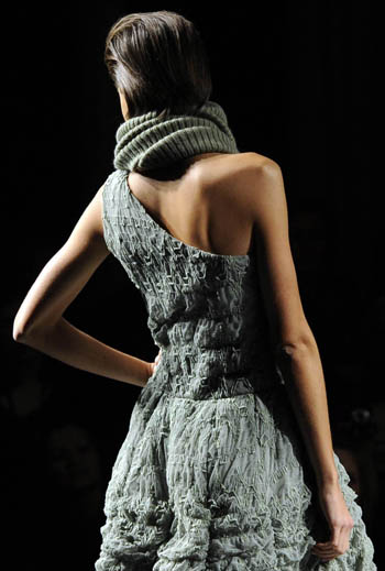 Las prendas son, principalmente, de colores grises con pinceladas de verde, rosa o negro. Ropa elaborada a través de tejidos como el moher, paño, visón, seda natural y algo de encaje.