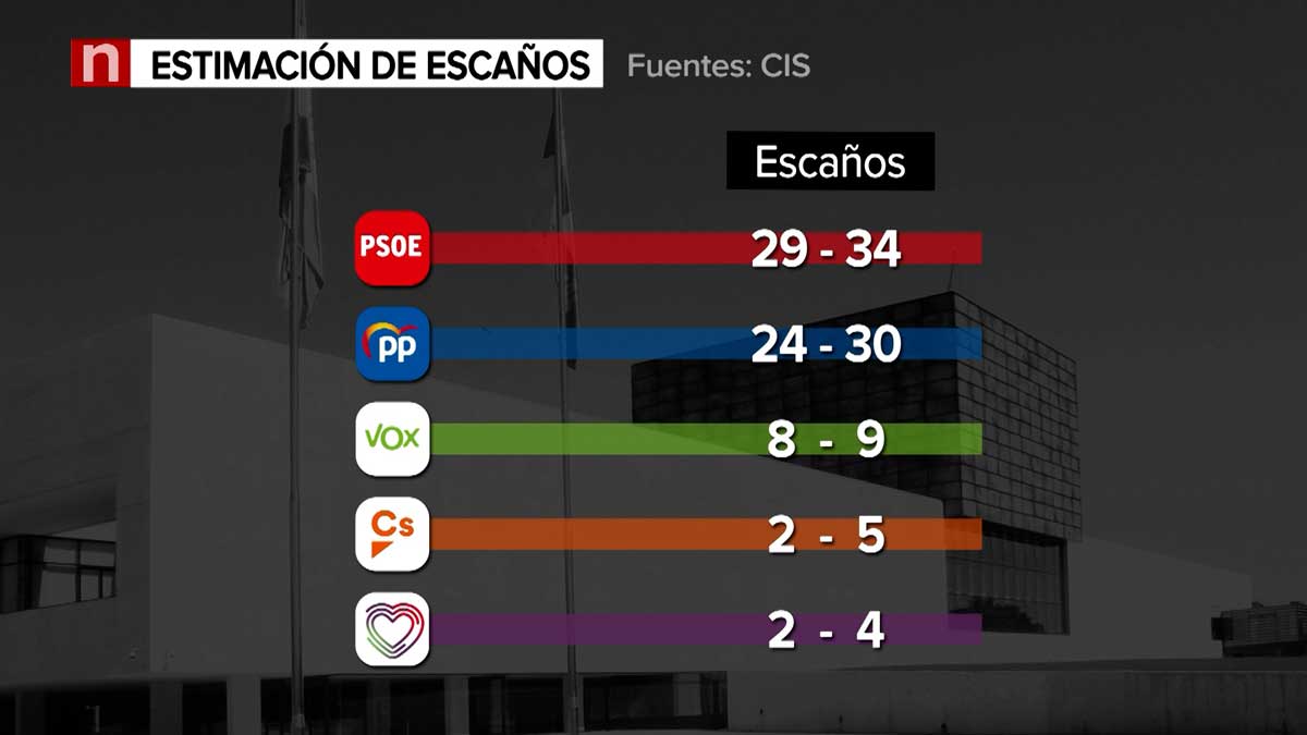 El PSOE vencería este domingo según el CIS con el 30’1 por ciento de los votos y un margen exiguo de apenas cuatro décimas sobre el PP que se haría con el 29’7. Con esos porcentajes predice que los socialistas tendrían entre 29 y 34 procuradores en las Cortes, frente a la horquilla de entre 24 y 30 que otorga los populares. Tras ellos VOX se convertiría en la tercera fuerza del hemiciclo con entre 8 y 9 escaños. Ciudadanos conseguiría entre 2 y 5 y Unidas Podemos entre 2 y 4.