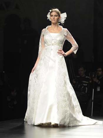 Los materiales usados por esta firma vallisoletana, que participó en la segunda jornada de la XII edición de la Pasarela de la Moda de Castilla y León, fueron pedrería de Swarovski y puntilla de chantillí, colocadas en los bordes de una cola de corte medieval que sale desde los hombros.