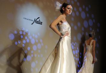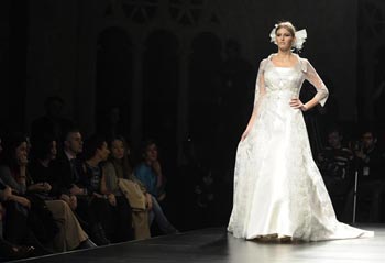 La colección denominada 'Ilusión' pretende reflejar un sentimiento que aboga por que todo recupere 'su nivel', un mundo donde los vestidos de novia se combinan con calzado en plata, tocados y muñequeras grises, que dan 'una armonía de color' en la pasarela.