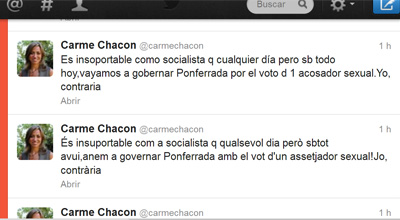 Pase lo que pase con el controvertido concejal, para Carmen Chacón "es insoportable como socialista" que su partido vaya a gobernar Ponferrada con el voto de "un acosador sexual". Y sobre todo en un fecha tan señalada como el 8 de marzo, Día de la Mujer. "Yo soy contraria", ha proclamado en la red social Twitter.