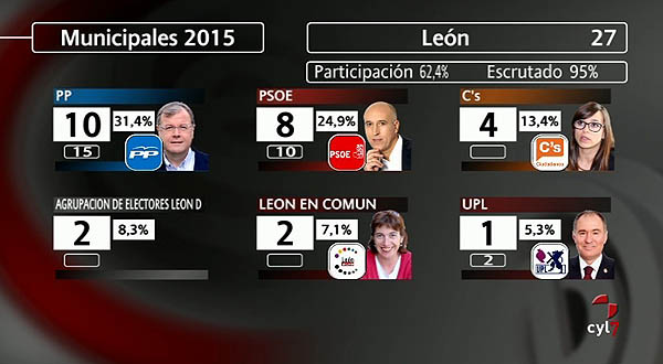 En ese sentido, los 'populares' del exconsejero Antonio Silván necesitarán apoyos para poder gobernar el consistorio leonés, donde su candidatura ha obtenido el 31,7 por ciento de los votos, mientras hace cuatro años logró el 44,6 por ciento. El PSOE de José Antonio Diez tendrá ocho concejales, dos menos que en 2011, puesto que ha logrado el 24,8 por ciento de los votos, prácticamente el mismo porcentaje que en la anterior cita con las urnas.