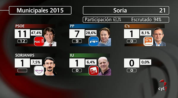 Por su parte, C's consigue el 8,15 por ciento de los votos y 1 concejal, Sorian@s el 7,43 por ciento y un edil e IU el 6,30 por ciento y otro concejal.