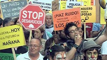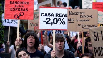 'Qué ocurre, qué ocurre, que no tengo curre'; 'Qué pasa, que pasa, que no tengo casa'; 'Mariano, Mariano, no llegas al verano, te espera, te espera, nuestra primavera'; 'Banca rescatada, familia desahuciada'; 'Al Banco de España, caña, caña, caña; 'Al Banco Central, igual, igual, igual'; 'La banca siempre gana y no me da la gana'; 'Educación y sanidad, públicas y de calidad'; 'Juan Carlos, mangante, deja al elefante'; 'Urdangarín, trabaja en Burger King', o 'Marichalar, trabaja en Pizza Hut' fueron una constante a lo largo del recorrido.