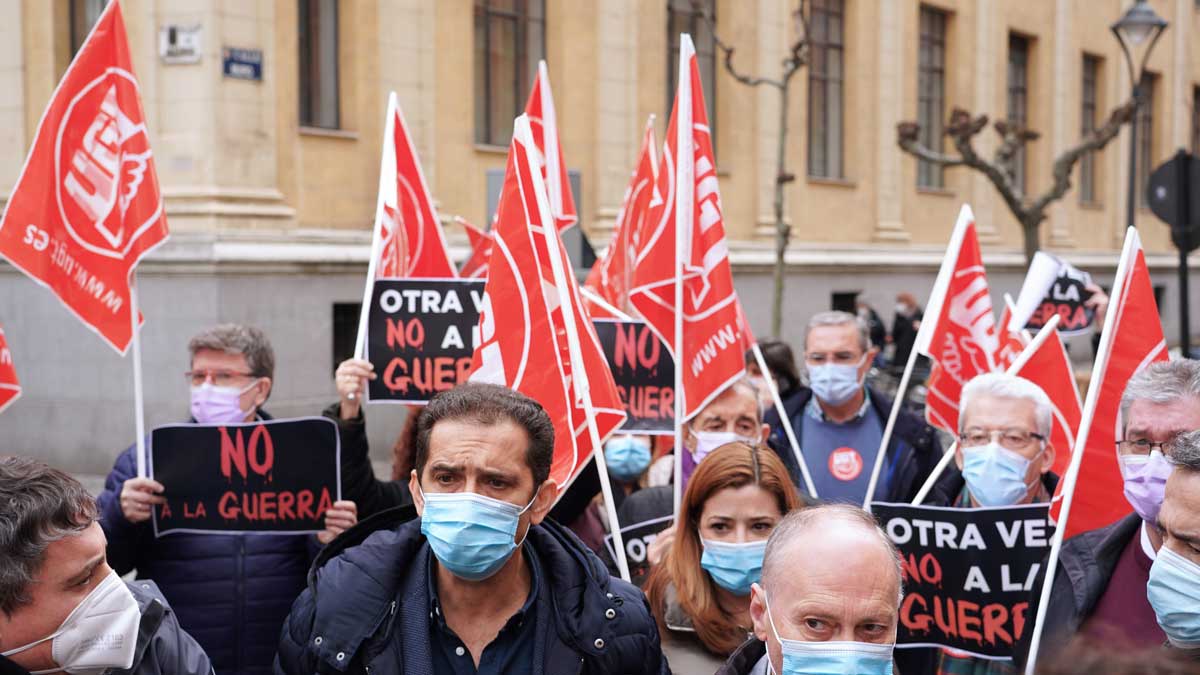 La protesta de delegados sindicales, dentro de los paros de cinco minutos convocados en todas las empresas, sirvió a los dirigentes de CCOO y UGT para exigir una negociación política encabezada por la ONU que detenga el conflicto bélico y económico, y su impacto en toda la sociedad civil. Faustino Temprano, quien comentó que los paros "simbólicos" se enmarcan en la convocatoria para toda Europa de la Confederación Europea de Sindicatos, exigió "negociación, diálogo y un acuerdo político para alcanzar la paz" y defendió que "Naciones Unidas debe ser el mediador para retornar a una estabilidad a la zona". Asimismo, revindicó "corredores seguros" para que la población civil pueda abandonar las zonas de guerra.
