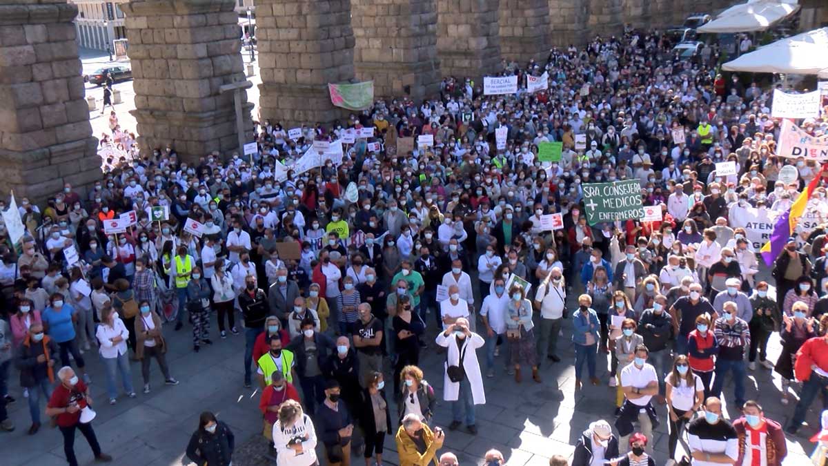 Centenares de personas, 2.000 según el PSOE en el Ayuntamiento de Segovia, se han concentrado este domingo en la popular Plaza del Azoguejo de Segovia para reclamar una "Sanidad rural digna" y oponerse a la reordenación sanitaria planteada para Castilla y León, a través de una manifestación que partió pasadas las 11.00 horas del ágora segoviana hacia el Hospital General de Segovia.