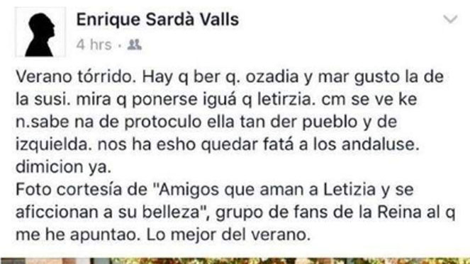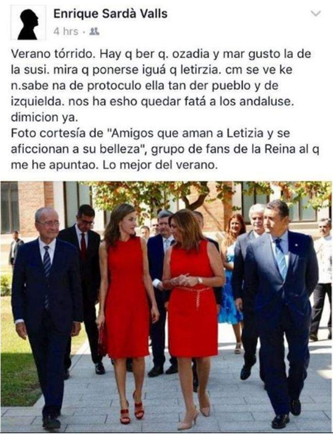 Sardà Valls, natural de Barcelona, publicó un comentario en su cuenta de Facebook en el que critica a la presidenta de la Junta de Andalucía por lucir un vestido similar al de la reina Letizia en un acto en Málaga, utilizando un lenguaje en el que intenta imitar el acento andaluz.