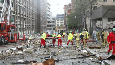 La otra cara de la tragedia comenzaba en el centro de Oslo. Una potente bomba cargada en un coche explotaba junto a la sede del Gobierno noruego y destrozaba también las fachadas de varios edificios gubernamentales de la zona, entre ellos las oficinas del primer ministro, que no resulta herido porque no estaba allí en ese momento. El caos y el desconcierto se han apoderado de la ciudad.