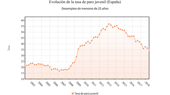 Pese a este repunte en el número de jóvenes en paro, la tasa de desempleo del colectivo descendió en el segundo trimestre hasta el 34,6%, frente al 36,3% del trimestre anterior y el 39,5% de hace un año, debido únicamente a la evolución de la actividad.