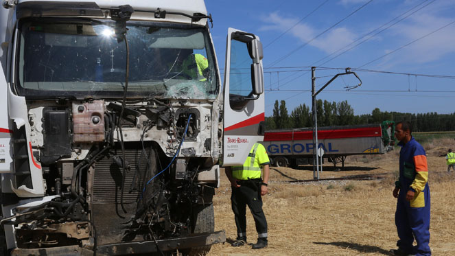 Un tren Alvia que hacía el recorrido entre Alicante y Santander colisionó frontolateralmente este martes alrededor de las 9.30 horas contra la cabeza tractora de un camión que se saltó el stop del paso a nivel del término palentino de Husillos. El suceso obligó a cerrar la vía durante alrededor de una hora, pero no se produjeron heridos, y sólo hubo que lamentar daños materiales. El tren no transportaba mercancías peligrosas.