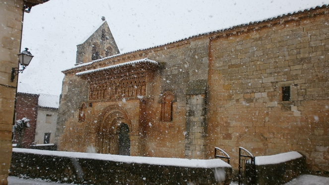 Encima de la portada se encuentra un friso en el cual aparece representado un Apostolado que flanquea la figura de Cristo sedente rodeado por el Tetramorfos. Los apóstoles portan libros o filacterias identificativas. Este friso está soportado por dos ménsulas también decoradas en los extremos. En la fachada septentrional existe otra portada cegada, con triple arquivolta apuntada coincidiendo con un capitel y jambas acodilladas a los lados. Existen también dos ventanas románicas en la fachada sur, decoradas con capiteles con hojas de acanto y grifos.