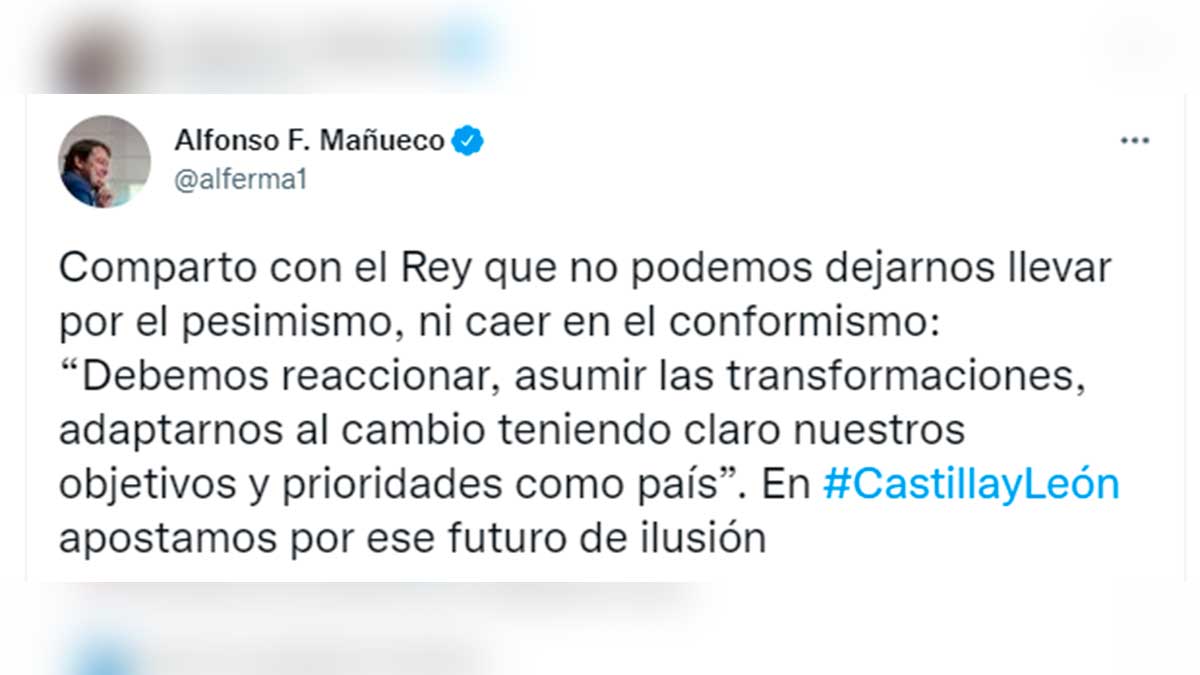 Además, Fernández Mañueco retuiteó otras dos partes del discurso de Nochebuena de Felipe VI como el respeto, el reconocimiento y lealtad a la Constitución y la capacidad de los españoles para sobreponerse ante las adversidades.