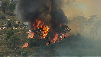 El incendio de Calcena, en Zaragoza, ha entrado esta mañana en el parque natural del Moncayo. Las llamas han arrasado más de 2.500 hectáreas a pesar de los esfuerzos de 200 efectivos, parte de ellos bomberos desplazados desde Lubia, en Soria. La misma lucha contra el fuego se está librando entre Madrid y Ávila.