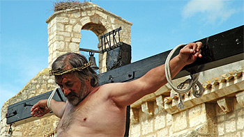 Reguero repitió su descuidada barba y pelo largo, a lo que se añade ya su dilatada experiencia. Sin relevo generacional y con la pesada carga de la cruz a sus espaldas, el vecino desprende en su rostro la agonía que sufrió Cristo en su muerte. El actor es elevado, crucificado y descendido con sumo cuidado por su compañeros cofrades ante la atenta mirada de unas 200 personas que se dieron cita ante la ermita románica de los siglos XI y XII, antes conocida como de Santa María y a partir de la mitad del siglo XVIII llamada ermita de Nuestra Señora de los Ángeles. En su interior, donde tras la Crucifixión se albergan los restos de Cristo, existen tres magníficas tallas de Jesús Crucificado de los siglos XII, XIV y XVI.