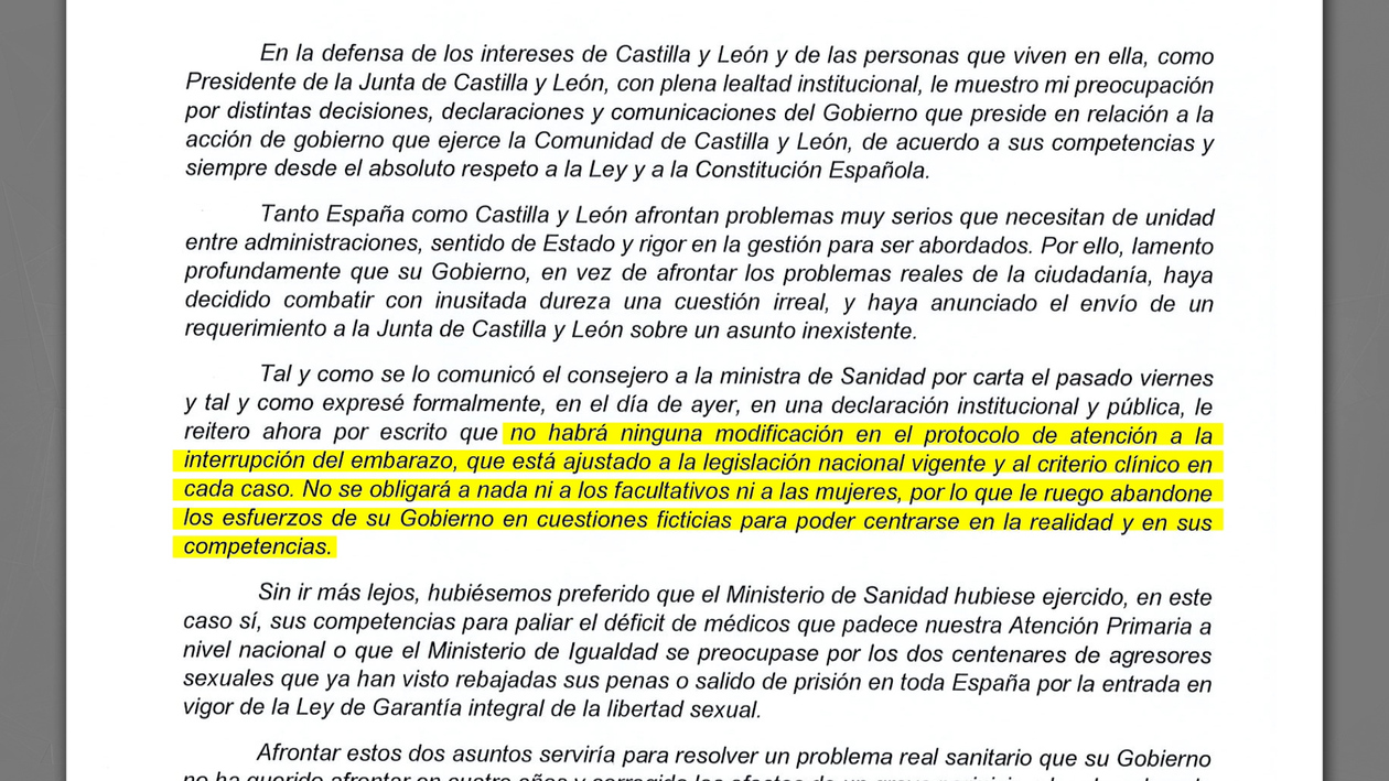 Para Mañueco el requerimiento se envía sobre una cuestión ficticia y así se lo explica en una carta que ya ha enviado a Pedro Sánchez. Insiste en que no habrá ninguna modificación del protocolo y que no se obligará a nada ni a los médicos ni a las mujeres.
