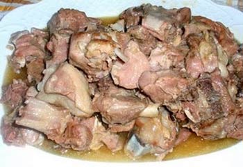 Se pica el cabrito en trocitos y se fríe en la sartén a fuego medio. Cuando la carne esté medio hacer se tiran trozos de pan a la misma y se fríen junto a la carne. Paralelamente se pica un poco de ajo y se machaca en el mortero con u poquito de aceite. La mezcla se esparce por encima de la carne.