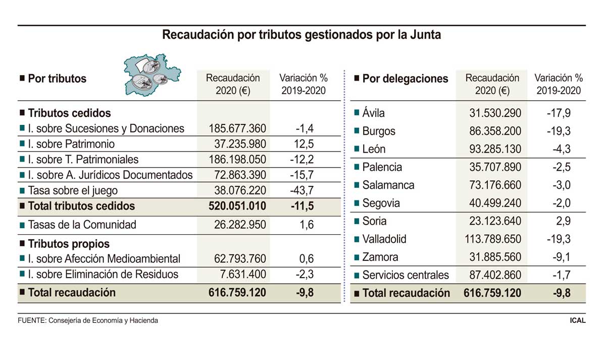 La recaudación tributaria de la Junta en Castilla y León cayó un 9,8 por ciento en 2020 en el año de la pandemia del COVID, con 67,2 millones de euros menos que fueron a parar a las arcas de la administración autonómico en concepto de tributos cedidos y propios. Los ingresos por impuestos de 616,7 millones vinieron lastrados por los efectos de la fuerte crisis sanitaria en la Comunidad, que se dejaron sentir de forma especial en el de transmisiones patrimoniales, con un descenso del 12,2 por ciento, al pasar de 212,1 a 186,1 millones de euros, y en la tasa sobre el juego, con un descalabro del 43,7 por ciento, hasta los 38 millones. Se trata de dos tributos que están "muy ligados" a la actividad económica, como es el sector inmobiliario y el juego.
