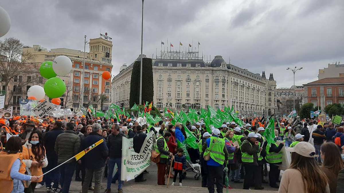 Agricultores, ganaderos, regantes y cazadores de toda España han tomado este domingo las calles de Madrid en una cita que califican de "histórica" con la que buscan reivindicar un futuro para el mundo rural con varios frentes abiertos: incremento de los costes de la energía, de las materias primas, la sequía, el conflicto bélico de Ucrania y el paro de los transportistas en España.