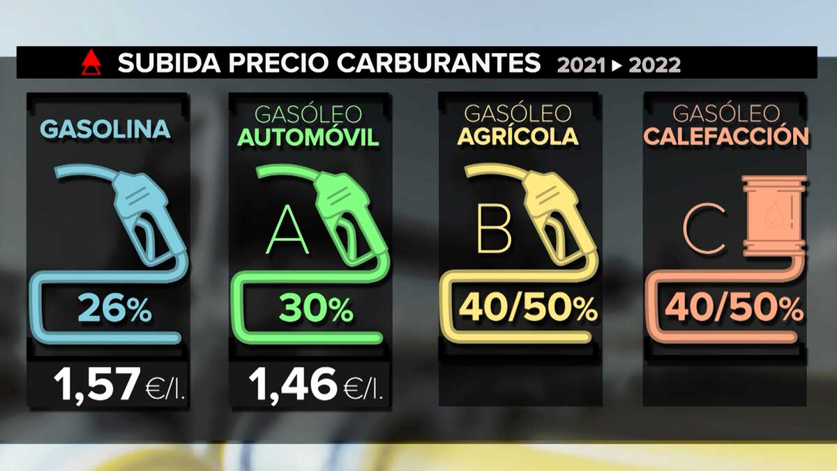 La gasolina está un 26 % más cara que hace un año; el litro de gasóleo se paga a 1,46 euros de media, es decir, un 30 % más que el año pasado. Lo mismo ocurre con el gasóleo tipo B (el agrícola) y el C (el usado para calefacción), que han incrementado sus precios entre un 40 y un 50 % en el último año. Los costes para las familias que utilizan gasoil a la hora de calentar la casa se han duplicado.