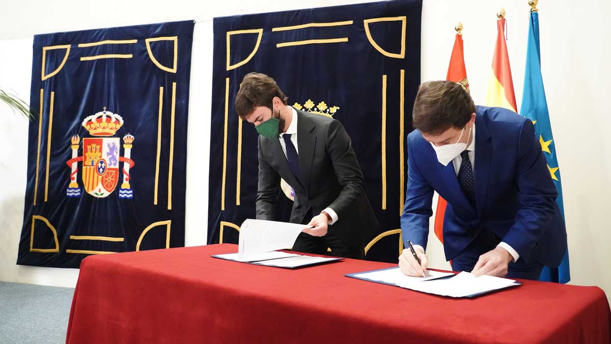 Fernández Mañueco y García-Gallardo, presidente y vicepresidente en el próximo Gobierno de coalición en Castilla y León, firmaron el acuerdo al término de la sesión constitutiva de las Cortes, ya que la Presidencia y Mesa de la Cámara también se encuentra en el pacto, al que llegaron in extremis.