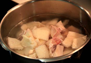 El guisao de tripas lleva bastante tiempo. Hay que mezclar el vientre con las patitas y cocerlo todo. Es necesario lavarlas mucho con sal, luego cocerlas y quitarles las escamas. Después se meten las tripas dentro del vientre, se hace una especie de bola, se ata una de las tripas y se pone a cocer dos horas con las patas, de dos en dos o las cuatro juntas.
