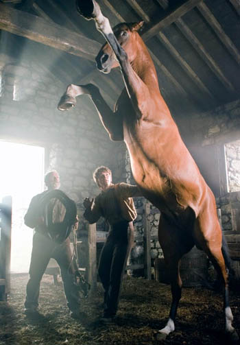 Otro rasgo de la cinta es el aporte de detalles que suman: la oca que defiende la granja contra los extraños o que picotea el pantalón de su amo para que se quede en casa, un banderín ajado por el sudor y los años, el agua de un simple cubo tras una jornada intensa, tijeras para cortar alambre que vuelan como estorninos, o esa pata que vacila bajo un cuerpo que no cede.
