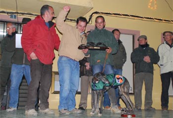 Entretanto el galgo Pistolero medía sus fuerzas contra el galgo, Inspirado, de la Sociedad Galguera “La Herradora”, de Toledo y campeón del II Grupo de Castilla La Mancha.