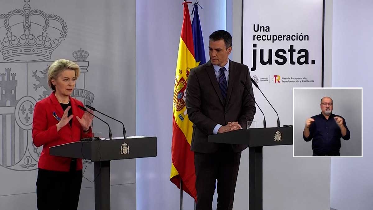 Así lo ha manifestado este sábado Von der Leyen en declaraciones a los medios tras la reunión mantenida en el Palacio de la Moncloa, en la que también han participado la vicepresidenta primera y ministra de Asuntos Económicos y Transformación Digital, Nadia Calviño, y la vicepresidenta tercera y ministra para la Transición Ecológica y Reto Demográfico, Teresa Ribera.