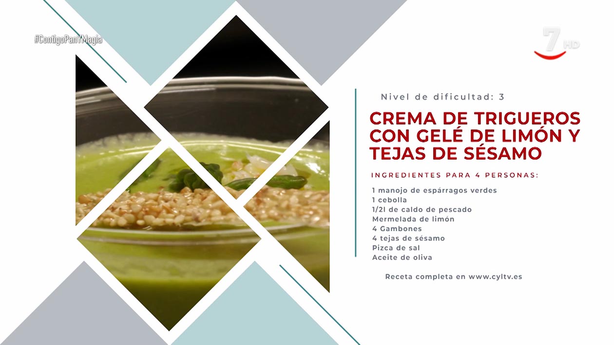 - En una copa de coctail poner en la base mermelada de limón a continuación la crema de esparragos y acabar con los gambones salteados, la teja de sésamo y un chorrito de aceite de oliva.