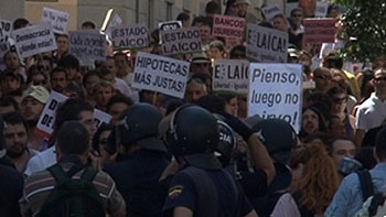 La Gran Vía está cortada a la altura de la calle Clavel, con un carril ocupado por los aproximadamente 200 'indignados' que se han sumando a la marcha que comenzaba a las 12 horas en el entorno de la Plaza de Oriente.