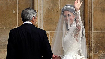Tras contraer matrimonio, recorrido nupcial: cinco calesas tiradas por 18 caballos trasladan a los recién casados, sus familias y damas de honor en procesión hasta el Palacio de Buckigham, donde la Reina Isabel II ofrece en estos momentos un almuerzo para los 600 invitados oficiales y particulares de la pareja.