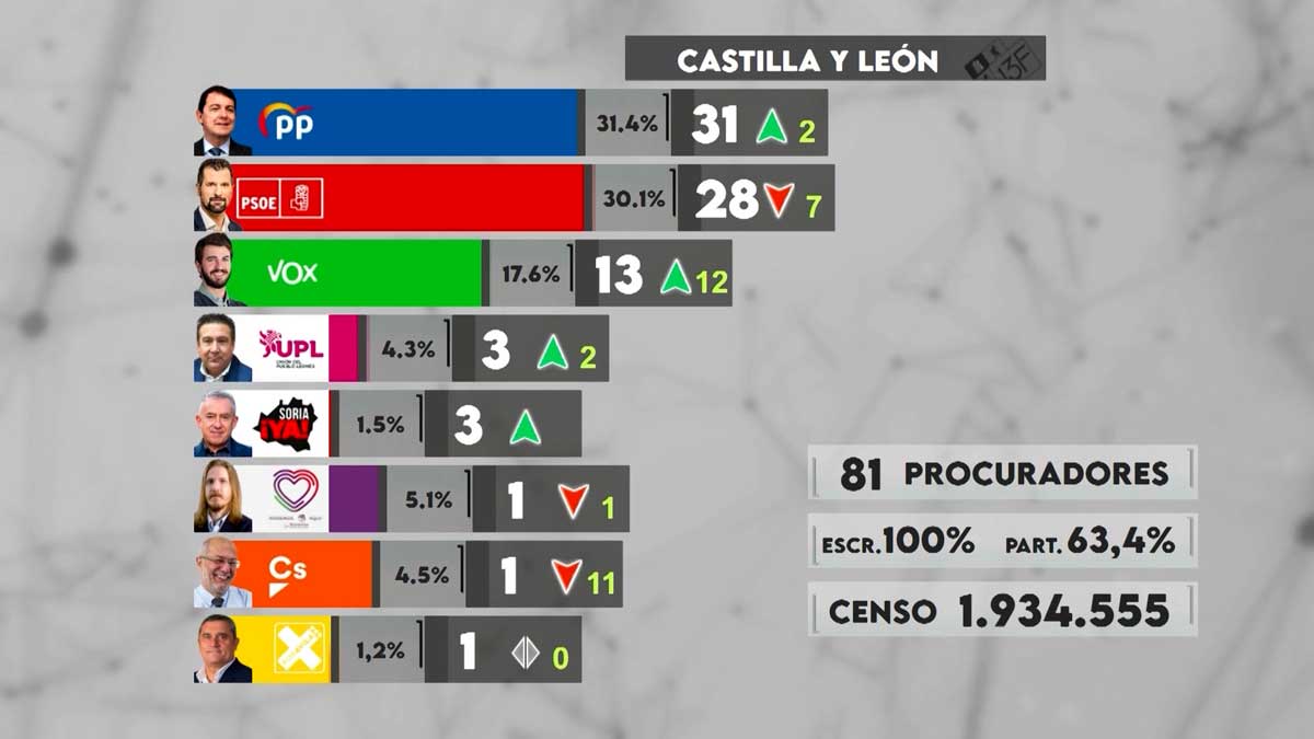 El Partido Popular gana las elecciones, pero no con la mayoría suficiente que buscaba. Consigue 31 escaños, dos más de los que tenía cuando convocó las elecciones. El PSOE no revalida su victoria de 2019 y se queda como segunda fuerza con 28 escaños, siete menos, y el gran vencedor de estas elecciones anticipadas, las primeras en Castilla y León es VOX que pasa de un escaño a 13. Consigue tres por la provincia de Valladolid, dos por León, Burgos y Salamanca y uno en Palencia, Segovia, Ávila y Zamora. La única provincia donde no saca escaño es en Soria. En esa provincia está el otro vencedor de estos comicios, la agrupación de electores Soria ¡Ya! que consigue tres escaños, los mismos que la UPL que también crece. Consigue 50.000 votos y tres escaños por León.