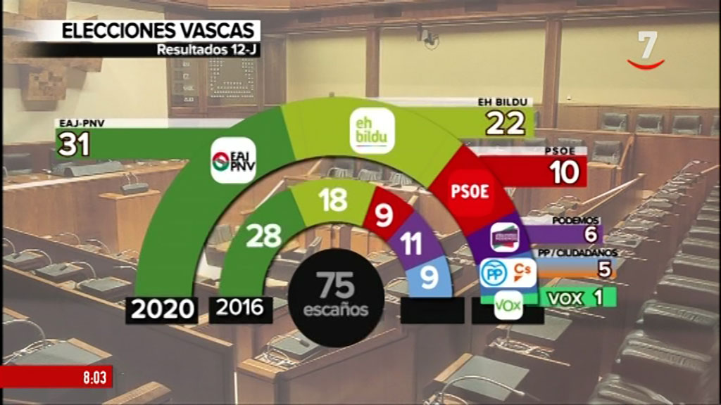Los 'morados' también han sufrido un batacazo el País Vasco, donde han pasado de tener 11 escaños a 6, igual que la coalición de PP y Ciudadanos, que ha conseguido tres menos de los que obtuvieron los 'populares' en solitario hace cuatro años.