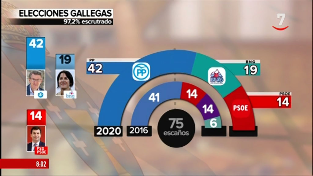En Galicia, con el 90 por ciento de los votos escrutados, Feijóo logra su cuarta mayoría absoluta consecutiva. El BNG ha recuperado el voto que 'cedió' a las 'Mareas' y a las candidaturas de Unidas Podemos y ha sobrepasado no solo a estos sino también al PSdeG, que no pasa de ser la tercera fuerza, aunque gana un diputado y se sitúa en 15 escaños.