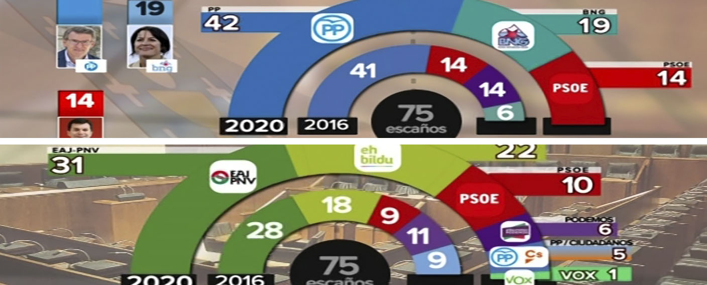 En ambas comunidades las urnas han arrojado, además, un fuerte aumento del voto nacionalista. El BNG logra la mejor marca de su historia, 19 diputados (con el 91 por ciento escrutado) y EH Bildu pasa de 18 a 21 en el Parlamento de Vitoria. En ésta Cámara, más de dos tercios de los escaños (52) serán nacionalistas y en ella se sentará también un diputado de Vox, que lo ha conseguido por Álava.