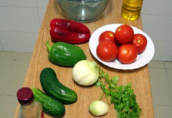 Se machacan dientes de ajo con sal. Se le echa agua lo más fría posible, junto al vinagre. Y luego se añade pan troceado, se le pica cebolla muy fina y se le echa todo por encima con una gotita de aceite de oliva.