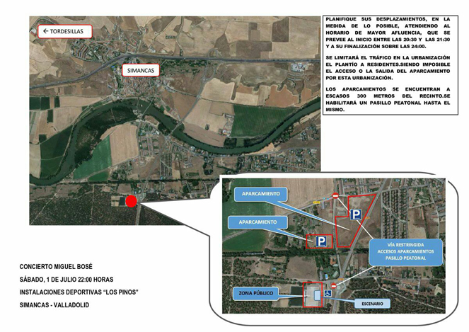 El Ayuntamiento de Simancas y la Organización del concierto de Miguel Bosé prevé un completo plan de accesibilidad y estacionamientos habilitados para la ocasión, limítrofes a las instalaciones deportivas ‘Los Pinos’, donde tendrá lugar el espectáculo de Bosé con el único objetivo de facilitar los accesos al recinto de forma cómoda y ordenada.