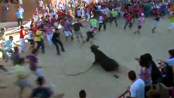Cientos de benaventanos esperaban impacientes frente al toril la salida de Negrita, el torito del Alba de este año. La segunda de las bombas anunciaba la salida inminente del astado y comenzaba la carrera.
