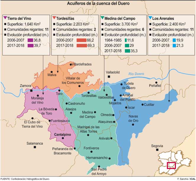 Los acuíferos de la cuenca del Duero se están secando y es posible afirmar que su estado cuantitativo no es bueno. El de Los Arenales -dividido en las masas de Medina del Campo (Valladolid y Ávila), Tordesillas, Tierra del Vino (un poco de Salamanca y Zamora) y Arenales (Segovia y Valladolid)- mantiene una trayectoria descendente y acumula ya una caída en la profundidad de sus aguas de 22 metros en las últimas tres décadas.