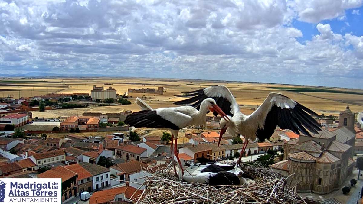 La dos cámaras instaladas en la torre de la iglesia de San Nicolás de Baria, en Madrigal de las Altas Torres, permiten ver de cerca a dos parejas de cigüeña blanca. El objetivo no es otro que conocer el comportamiento de estos animales en diferentes momentos de sus vidas.