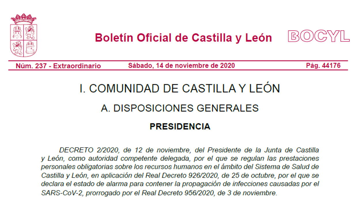 El presidente de la Junta de Castilla y León, Alfonso Fernández Mañueco, establece mediante un decreto, como autoridad competente delegada por el estado de alarma, las "prestaciones personales obligatorias", por el tiempo "indispensable", sobre los recursos humanos del sistema sanitario. Así lo recoge este sábado el Boletín Oficial de Castilla y León (Bocyl) con el objetivo de reforzar el servicio de salud y hacer frente a la pandemia del COVID-19.