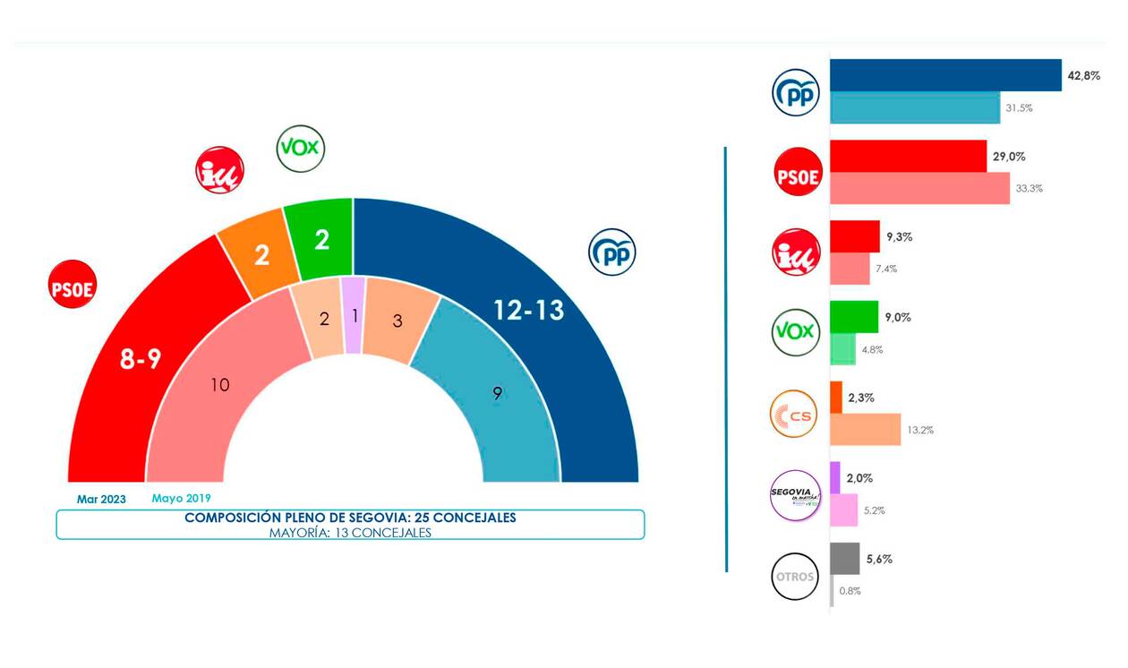 A menos de dos meses para que se celebren las elecciones municipales en toda España, el Partido Popular se convertiría en la estructura con más apoyos, con el 42,8% de los votos, consumaría el sorpaso al PSOE y tendría opciones serias de recuperar la alcaldía. Un crecimiento del 11,3% que chocaría con el descenso del 4,3% socialista, que dejaría de ser la lista más votada y se estancaría en el 29%.