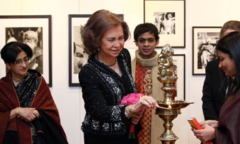 A su entrada en el edificio, rodeada de vítores y exclamaciones de "¡Guapa!", la reina Sofía fue recibida con una ramo de rosas y, al acceder a la exposición, fue invitada a rendir tributo a la divinidad hindú Ganesha, representada en lo más alto de una deepa (lámpara), donde encendió cinco llamas dentro del ritual seguido en la tradición india para purificar el ambiente y desear suerte antes de celebrar cualquier evento.