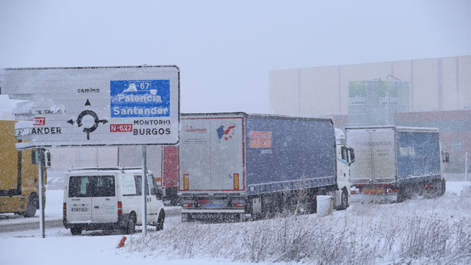 La Guardia Civil procede a dar salida a los doce camiones embolsados que pasaron la noche en la A-67 en el polígono de Aguilar de Campoo (Palencia), formando para ello pequeños convoyes con máquinas quintanieves que, progresivamente y en pequeños grupos, abren paso a los vehículos pesados con dirección a Cantabria. El objetivo de realizar poco a poco el desembolsamiento se produce para evitar que los camiones se crucen e impidan circular a los turismos, según informó la Subdelegación del Gobierno en Palencia.