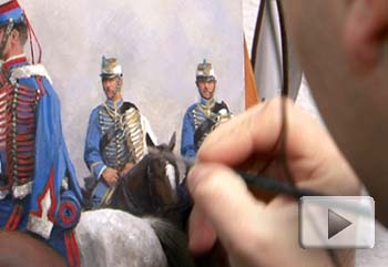En su taller, apenas ocho focos iluminan el caballete frente al que se sienta diariamente. Realista, detallista y minucioso...Investigador de trajes, tendencias, artilugios (militares) y estudioso del caballo.