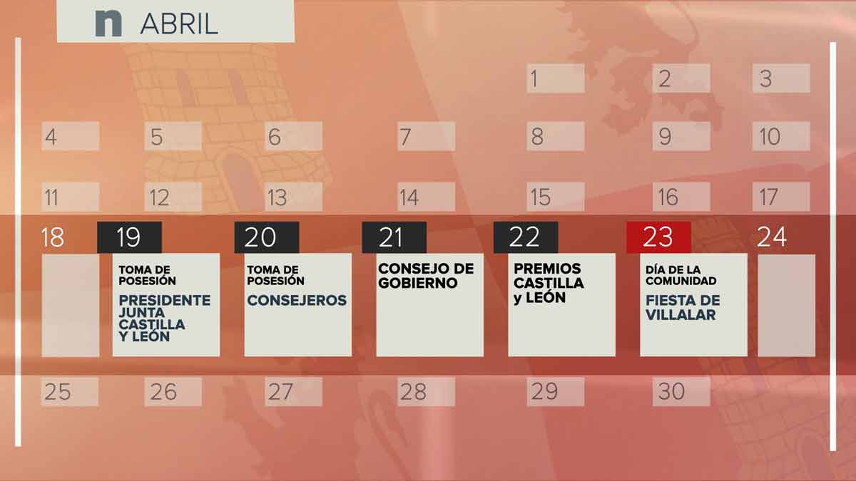 El calendario político en Castilla y León está repleto de citas importantes. La primera fecha señalada es el martes con la toma de posesión de Alfonso Fernández Mañueco como presidente de la Junta. El miércoles, 20 de abril, la toma de posesión de los consejeros del nuevo Gobierno regional. El jueves se realiza el primer consejo de Gobierno, el viernes se convocan los Premios Castilla y León y finalmente, este sábado, 23 de abril, se celebra el día de Villalar.