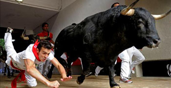 Los toros han llegado a la curva de Estafeta con mucha velocidad y se han vivido momentos de mucho peligro. Uno de los astados ha embestido fuertemente a uno de los corredores, que ha quedado tendido en el suelo.