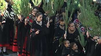 Con los "pinochos" o ramas de pino en mano, las vecinas de Vinuesa, vestidas de piñorras han recorrido las calles de esta localidad soriana hasta llegar a la plaza del Ayuntamiento donde han representado el tradiconal combate denominado "La Pinochada".