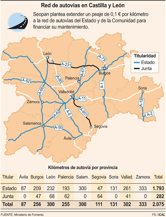 Castilla y León se vería así afectada por el cobro en los 2.075 kilómetros de autovías que cruzan las nueve provincias, 1.793 de titularidad estatal y 282 autonómica. Los recorridos hasta Madrid desde las tres ciudades situadas más al norte, León, Palencia y Burgos, serían los más afectadas por la implantación de peajes, aunque también se verían gravados itinerarios con una alta densidad de tráfico, como el recorrido entre Palencia y Valladolid.