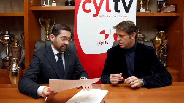 El director general de Radio Televisión de Castilla y León, Eduardo Álvarez, y el presidente del Real Valladolid, Carlos Suárez, firmaron este martes un convenio de colaboración por el cual la televisión autonómica pasa a ser el proveedor oficial de los contenidos audiovisuales de realvalladolid.es, sus redes sociales y fundacionrealvalladolid.es, y el primer equipo blanquivioleta lucirá hasta final de temporada el logotipo cyltv en su camiseta de juego (entre el cuello de la camiseta y el nombre del futbolista).